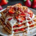 A stack of three golden-brown waffles sits on a white plate, each waffle layer separated by a generous spread of bright red strawberry slices. The top waffle is adorned with more fresh strawberries, a drizzle of white cream sauce flowing down the sides, and sprinkled with crunchy brown crumbs. The plate rests on a white marbled surface, with a few whole strawberries scattered around. photo taken with an iphone --ar 4:5 --v 7