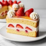 Keywords: Strawberry cake, custard cake, layered dessert, vanilla custard, fresh strawberries, whipped cream cake, homemade cake
