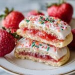 Delight in these Strawberry Pop Tart Sugar Cookies, featuring a soft sugar cookie base filled with sweet strawberry jam and adorned with festive sprinkles. Perfectly tender and lightly golden, these cookies combine the nostalgic flavor of pop tarts with the homemade charm of sugar cookies, making them a fun treat for any occasion.