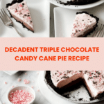 The Triple Chocolate Candy Cane Pie is a festive and indulgent dessert featuring a peppermint chocolate cookie crust, a rich peppermint chocolate cream filling, and a luscious peppermint chocolate whipped cream topping. Finished with chocolate shavings and crushed candy canes, this no-bake pie blends creamy textures with refreshing minty notes, perfect for holiday celebrations.