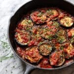 6. Bake: Cover the skillet or casserole dish with aluminum foil and bake in the preheated oven for 45 minutes. The eggplant should become very soft and the sauce should reduce slightly.