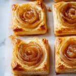 The image shows six square puff pastries arranged in two rows on a white tray. Each pastry has several layered, golden-brown, flaky edges that are thick and crisp. In the center of each square is a round, tightly coiled swirl of caramelized pear slices, glowing with a shiny, light brown glaze. The layers of the pears are thin and look soft, with a slightly translucent texture, standing out against the rich strands of layered dough around them. The white tray is placed on a white marbled surface, with a few small crumbs and flakes scattered near the bottom. Photo taken with an iphone --ar 4:5 --v 7