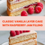 This Vanilla Layer Cake with Raspberry Jam is a classic, moist, and fluffy vanilla cake layered with sweet raspberry jam and finished with a smooth, creamy vanilla buttercream frosting. It’s a perfect dessert for celebrations or any special occasion, combining the delicate flavor of vanilla with the tangy sweetness of raspberry jam.
