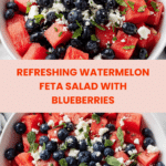 A refreshing and vibrant Watermelon Feta Salad combining juicy watermelon cubes, sweet blueberries, and tangy crumbled feta cheese, all tossed with a zesty honey lime dressing and fresh mint and basil leaves. Perfect for a light summer appetizer or side dish.